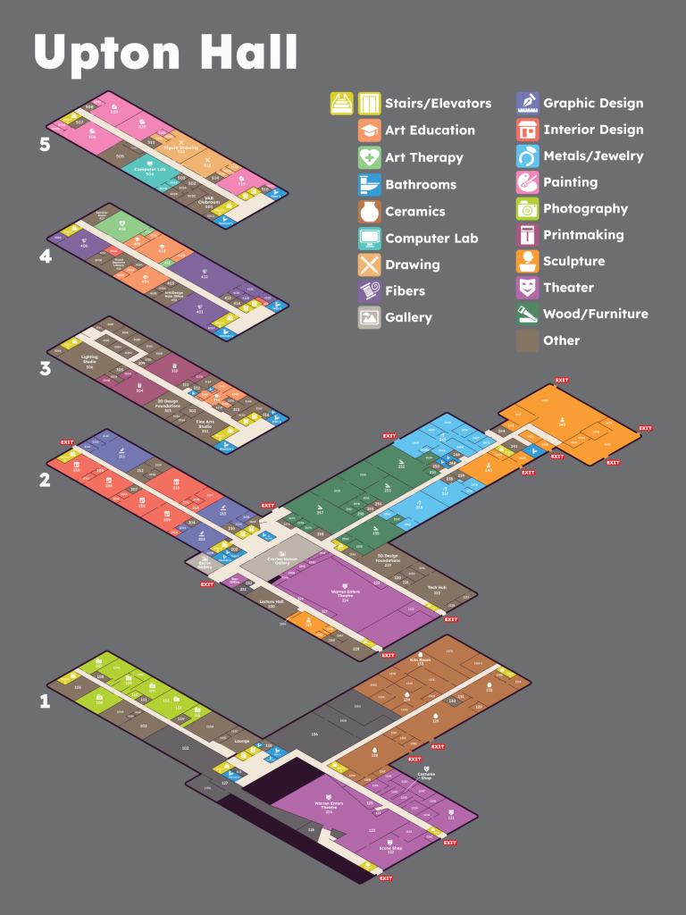 A map of all five floors of Buffalo State University’s building Upton Hall.